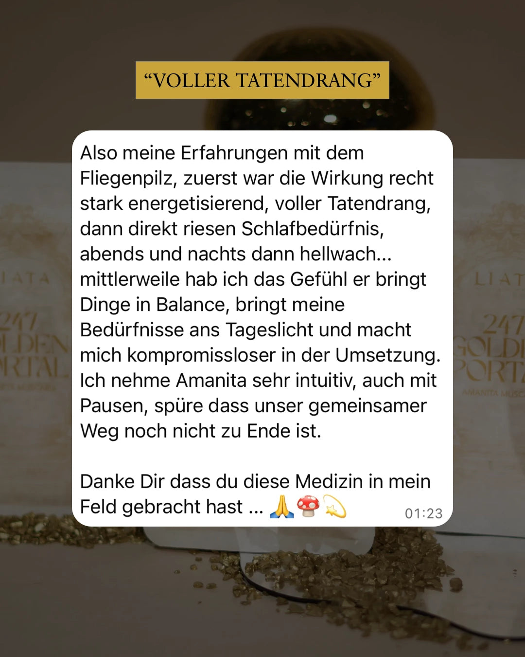 Amanita Muscaria ist hier, um dich an dein höchstes Selbst zu erinnern: Sein Spirit wirkt sich auf subtile Weise auf die verschiedenen Ebenen deines Bewusstseins aus und bringt Körper und Geist zurück in seinen natürlichen Einklang. So, dass du in Leichtigkeit den Weg gehen kannst, für den du geboren wurdest.